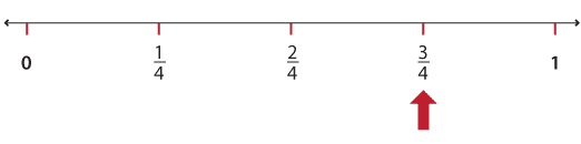 If we want to locate \(\dfrac{3}{4}\) on the number line we start with a number line from 0 to 1. We break the segment between 0 and 1 into 4 equal parts. Each part is one-quarter. We mark \(\dfrac{3}{4}\) with an arrow.