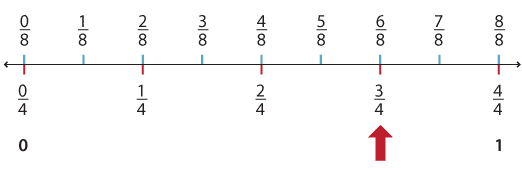 We can also break the segment between 0 and 1 into 8 equal pieces. Each piece is one-eighth. We see that \(\dfrac{6}{8}\) marks the same place as \(\dfrac{3}{4}\), so we say that they are equivalent.