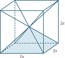 Consider a cube of side length 2x. If we draw the four long diagonals as shown, then we obtain six square-based pyramids, one of which is shaded in the diagram.