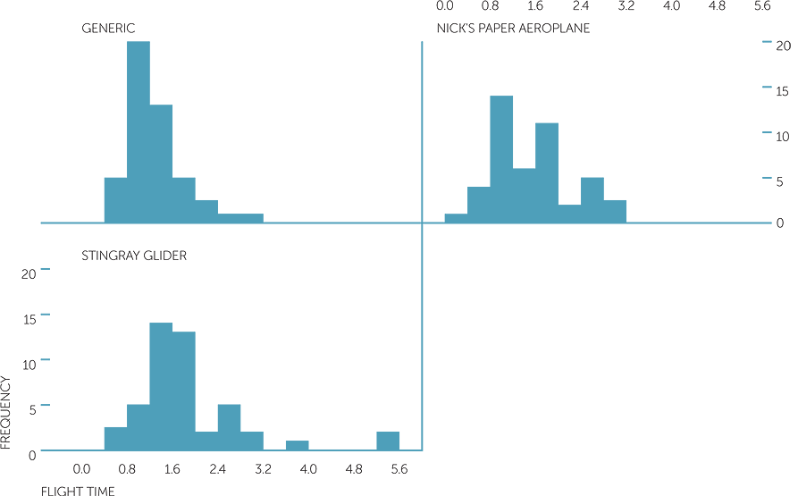 The average flight times for the generic, nick’s and stingray designs were, respectively, 1.3 secs, 1.56 secs, 1.8 secs, and the median times were, respectively, 1.15 secs, 1.5 secs, 1.66 secs. We see that the stingray design had a few considerably longer flights (and so skew to the right) and tended to have slightly longer times than the other two, and that the generic design’s times tend to be slightly shorter than Nick’s design and less variable.