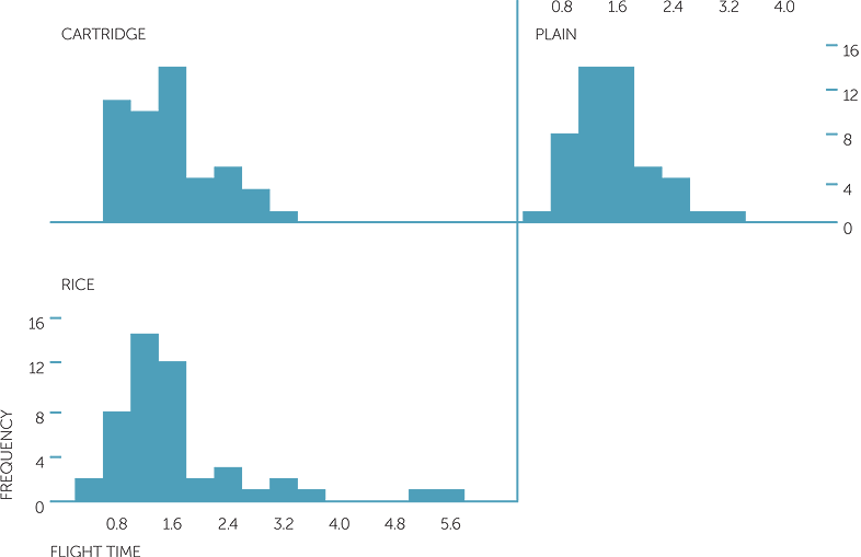 The average flight times for the cartridge, plain and rice papers were, respectively, 1.54 secs, 1.5 secs, 1.66 secs, and the median times were, respectively, 1.5 secs, 1.4 secs, 1.3 secs. We see that all three groups are skew to the right. The rice paper had a few considerably longer flights but otherwise did not tend to have longer times than the other two. There’s not a great deal of difference between the three papers.