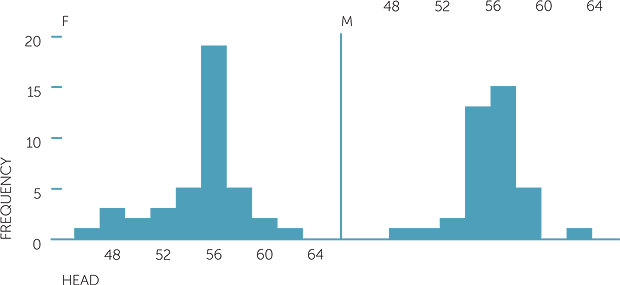 We see that for both females and males, the head circumferences tend to be skew to the left. There is not as much difference between males and females as one might expect, but the females’ circumferences tend to be more variable.