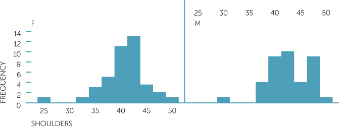 For the shoulder widths, apart from one unusually small female, the females’ shoulder widths are quite symmetric, ranging from about 32 to 52 cm and concentrated around approximately 42 cm, while the males’ shoulder widths (apart from a smaller value) are fairly evenly spread over approximately 38 to 58 cm.