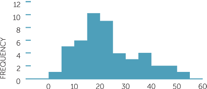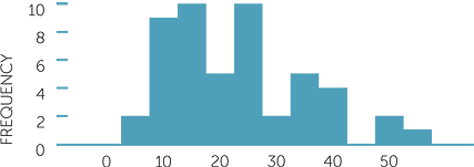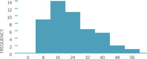 So there is not much difference between the average and the median, and either gives a reasonable measure of centre of the data. How do the data compare on each side of the average/median? On the lower side of the “centre” the values are more squashed together than on the upper side. Using the median as “centre”, the lower half of the observations range over 18 values, from 4 to 22, while the upper half range over 30 values, from 23 to 53. We can see easily in the stem-and-leaf plot and two of the histograms above, that the upper half of the data are considerably more spread out than the lower half of the data.