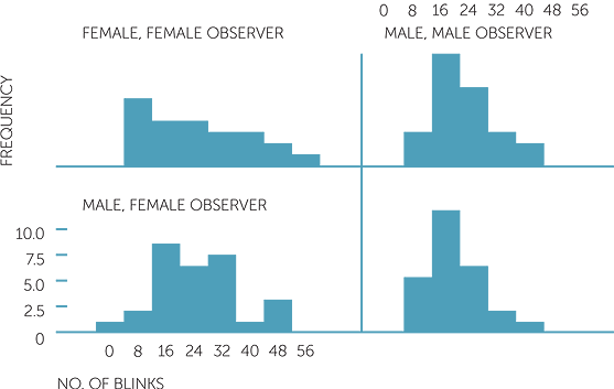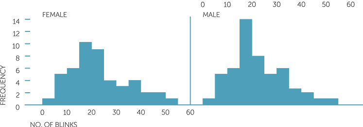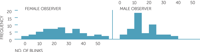 Below are histograms of the number of blinks per minute for male and female observers separately. Note that the histograms are again on the same scale.