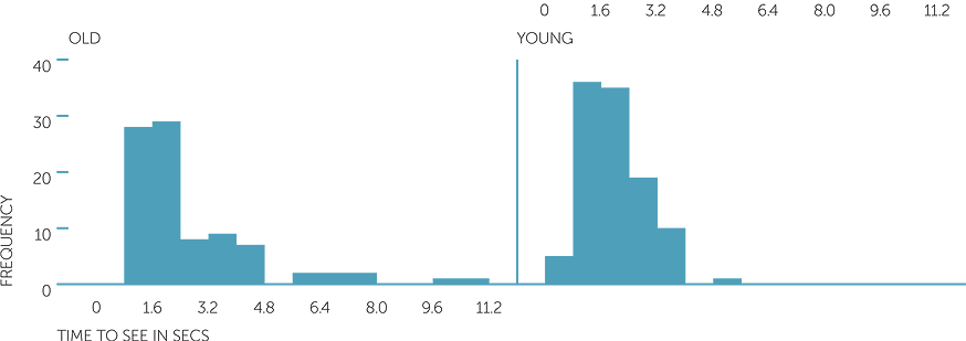 For the 113 people who saw the picture of the young man first, the average time to see the picture was 2.15 secs and the median was 1.95 secs, while for the 89 who saw the picture of the old man first, the average time to see the picture was 2.64 secs and the median was also 1.95 secs. The times to see the young man ranged from 0.59 to 6 secs, while the time to see the old man ranged from 0.89 to 10.4 secs.