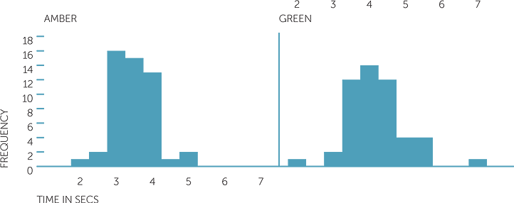 The average time to travel the last 50 metres approaching amber lights was 3.44 secs and the median time was 3.48 secs, while for approaching green lights, the average was 4.17 secs and the median was 4.1 secs. The times for approaching amber lights ranged from 2 secs to 4.9 secs and for green lights, from 2 secs to 8.6 secs.