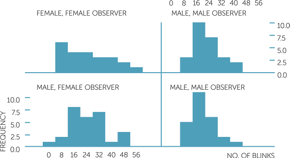 The boxplots provide us with an instant overview that emphasizes the differences between female and male observers for female and male subjects. The numbers of blinks are more variable for both subject genders for female observers, but much more for female subjects than male subjects. For the male observers, the median and the spread of the number of blinks are similar for female and male subjects but the female data are considerably skew to the right, and much more than the male data.