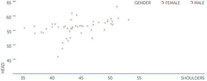 In this plot different symbols are used for females and males in plotting head circumference against shoulder width. We see that for males and females, there is very little relationship between head circumference and shoulder width, and that there appears to be a group of females with unusually small head circumferences for their shoulder widths.