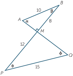 | a | Let A = α. Then using adjacent angles and the angle sums of the triangles, ACM = 90° − α, BCM = α, and B = 90° − α. |