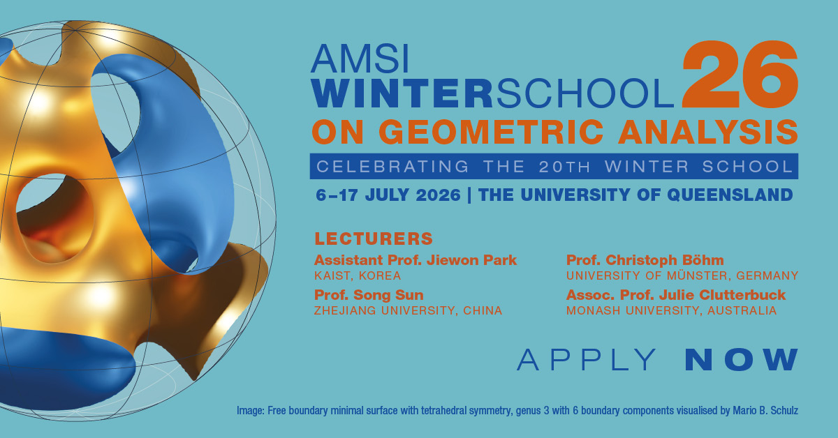The 2026 Winter School, hosted by the UQ School of Mathematics and Physics, will focus on Geometric Analysis—a field experiencing rapid global growth and of high demand among graduate students and early-career researchers due to its foundational role in modern mathematics.