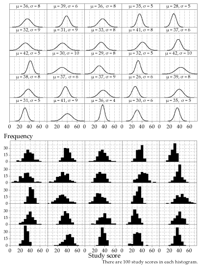 Figure 33: 25 different Normal distributions (upper part) and histograms of random samples from each of them (lower part); the same sample size \(n=100\) has been used throughout.