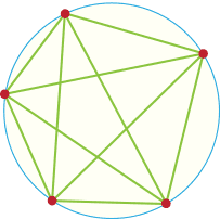 Then there is the data collection method that finds a pattern for the data collected. This leads to the pattern being assumed for all situations. But sometimes this conclusion is false. The regions problem works this way. Take a circle and choose some points on its boundary. In joining up all the points with straight lines you produce a number of regions (see Figure 6). The number of regions appears to double as the number of points increases. This is certainly what the data up to 6 points suggests. However, it all goes horribly wrong with 6 points.