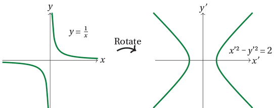 \[ \begin{bmatrix} x \\ y \end{bmatrix} = \begin{bmatrix} \cos \frac{\pi}{4} & - \sin \frac{\pi}{4} \\ \sin \frac{\pi}{4} & \cos \frac{\pi}{4} \end{bmatrix} \begin{bmatrix} x' \\ y' \end{bmatrix} = \begin{bmatrix} \frac{1}{\sqrt{2}} & \frac{-1}{\sqrt{2}} \\ \frac{1}{\sqrt{2}} & \frac{1}{\sqrt{2}} \end{bmatrix} \begin{bmatrix} x' \\ y' \end{bmatrix} = \frac{1}{\sqrt{2}} \begin{bmatrix} x' - y' \\ x' + y' \end{bmatrix}. \]Hence the curve $y=1/x$, or $xy = 1$, is mapped to points $(x',y')$ such that